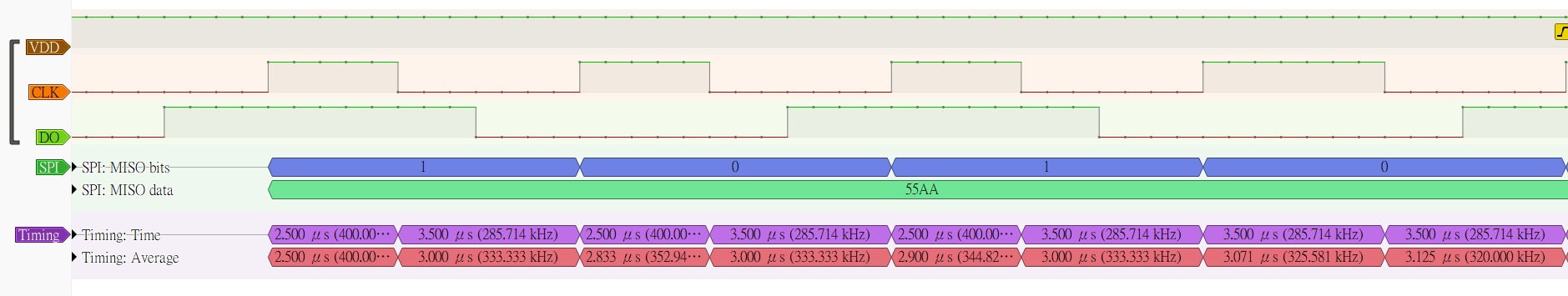 放大後可以看到,由於 Bit-banging 是由軟體控制 GPIO 腳位,每次的切換有延遲,以及由於考慮 Setup Time 和 Hold Time,和無法抵消 MCU 處理迴圈控制邏輯所產生的額外開銷,導致 Clock 的 Duty Cycle 無法達到完美的 50%。