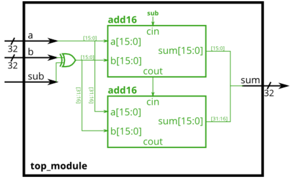 add16 adder_hi(.a(a[31:16]), .b(xor_out[31:16]), .cin(cout_lo), .sum(sum[31:16]), .cout(cout_hi_unused));