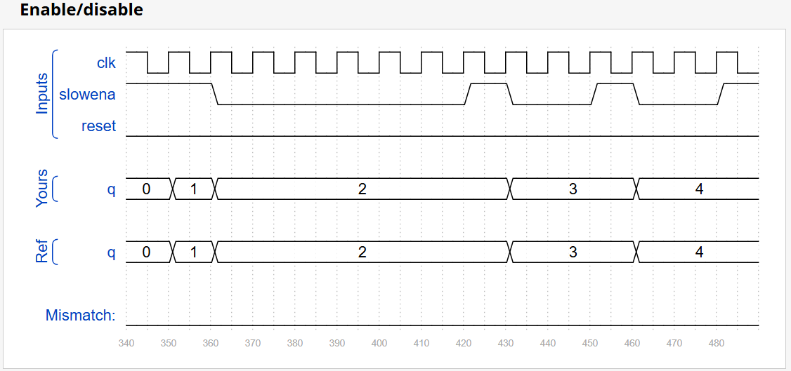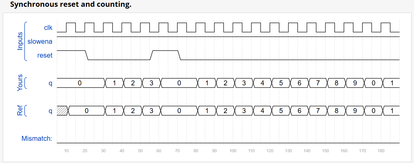 Build a decade counter that counts from 0 through 9, inclusive, with a period of 10. The reset input is synchronous, and should reset the counter to 0. We want to be able to pause the counter rather than always incrementing every clock cycle, so the slowena input indicates when the counter should increment.