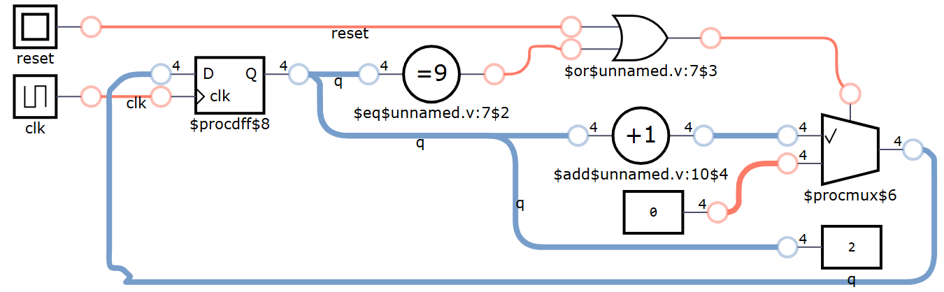 Build a decade counter that counts from 0 through 9, inclusive, with a period of 10. The reset input is synchronous, and should reset the counter to 0.