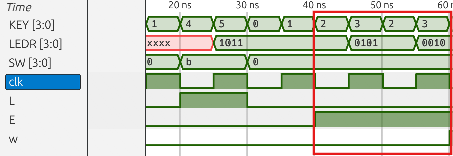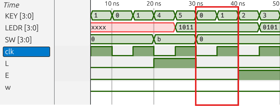 KEY[3:1] = 0; // Clear control signals (w, L, E)